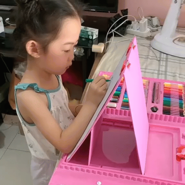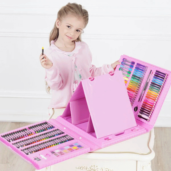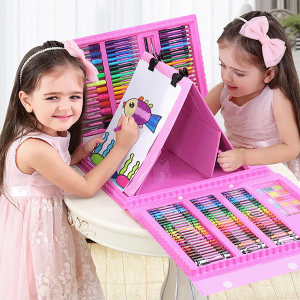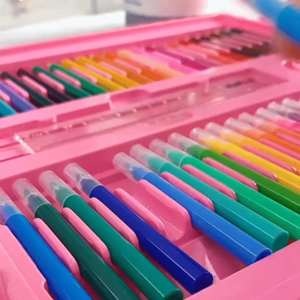 ✔️ Комплет од 176 парчиња – Содржи широк асортиман на боици, фломастери, пастели, бои и други алати за цртање и боење.