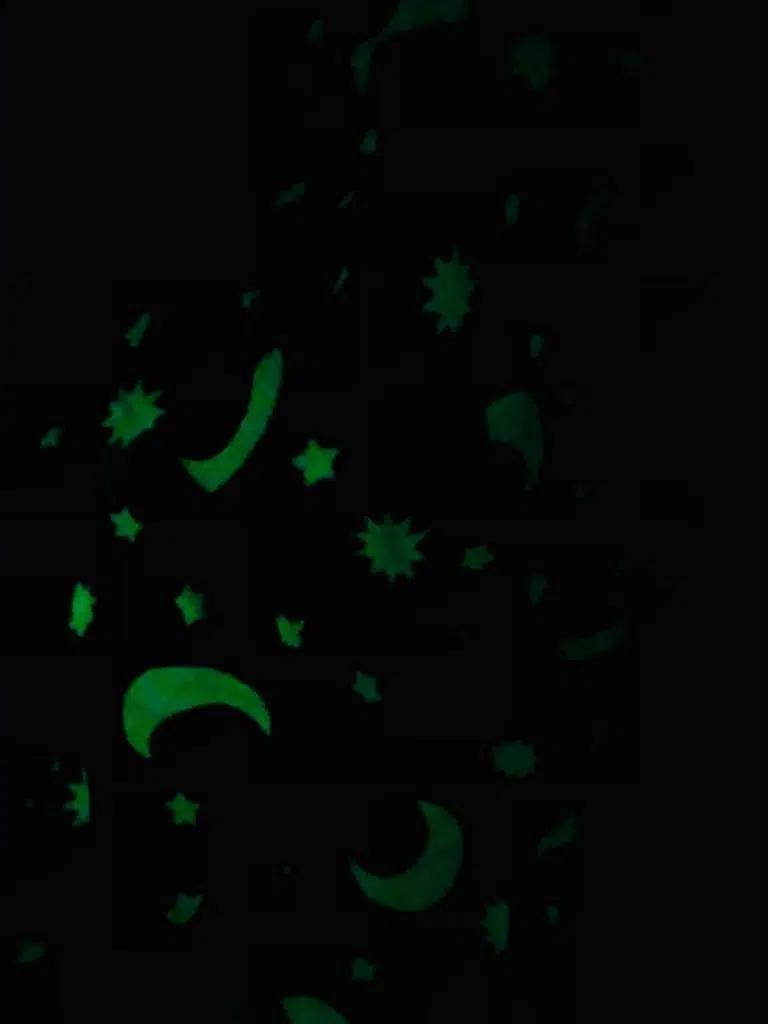 Флуоресцентните фигури ќе светат неколку часа по изложувањето на светлина. Колку подолго ќебето е изложено на светлина, толку посветли и подолго ќе светат фигурите.