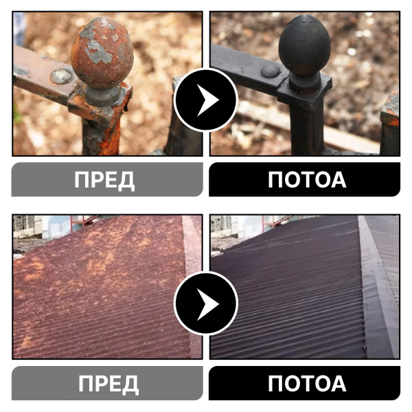 "Производот е неверојатен! Имав стара железна ограда која беше целосно ’рѓосана и мислев дека ќе треба со денови да ја стругам. Го нанесов овој агент и за кратко време ’рѓата се претвори во цврста црна подлога спремна за фарбање. Заштедив многу време и пари!" ⭐⭐⭐⭐⭐