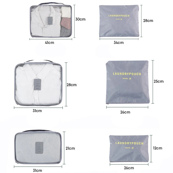 Комплетот вклучува 6 различни типови на чанти: три организатори и три торбички. Организаторите се идеални за сортирање облека, чевли, козметика или други потреби, додека торбичките се одлични за складирање на помали предмети како тоалети, електроника или ситници.