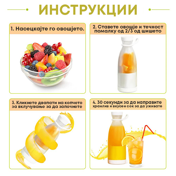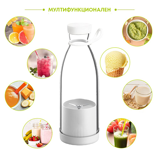 Практичен уред кој ти овозможува да подготвуваш вкусни и здрави оброци насекаде. 2 Во 1 функција - блендер и шише за пиење, давајќи ти можност брзо и лесно да подготвиш смути, сок, протеински шејк или кој било друг пијалок, дури и во движење!
