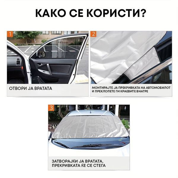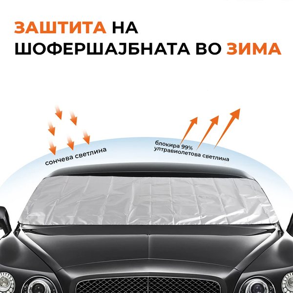 Немаш време да го исчистиш замрзнато ветробранско стакло? Навечер покриј го автомобилот со оваа магична прекривка и кафето наутро ќе можеш да го испиеш мирно и да не брзаш бидејќи само треба да ја тргнеш прекривката од шофершајбната. Со таква заштита ќе го продолжиш животниот век на бришачите, бидејќи тие ќе бидат заштитени под церадата.